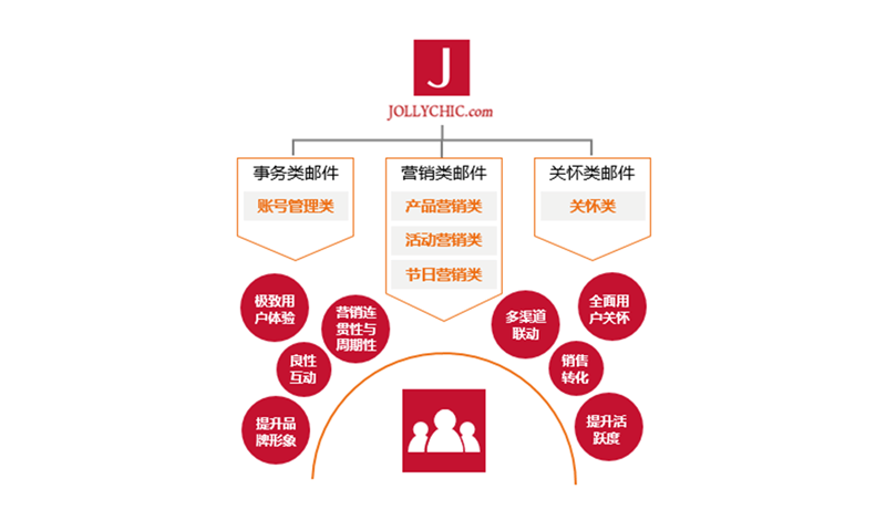 “产品营销类”、“活动营销类”、“节日营销类”邮件这三类是以营销为主,也是JollyChic网站的主体需求。“产品营销类”中新品推荐和免费体验邮件恰好能够对应JollyChic网站的“新、“免费试用”栏目,契合JollyChic网站产品营销规划,能够更加精准的营销。“活动营销类”邮件能够满足B2C网站活动营销需求,同时加上多渠道联动,能够全方位的帮助JollyChic网站实现活动营销带来转化。“节日营销类”则针对目前主流营销节日与传统节日做营销活动,能够为JollyChic网站带来较高的营销连贯性与周期性。